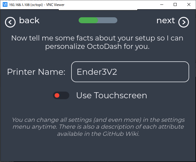 VNC Viewerを起動。Raspberry Piに接続しやっとOctoDash画面に到達。nextをクリックして進む。
